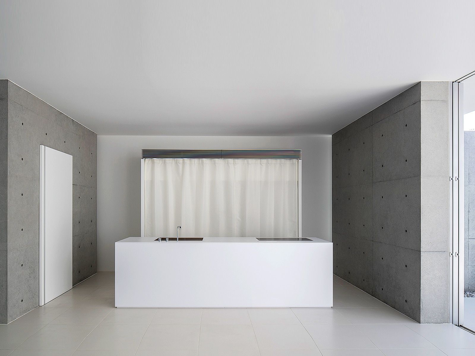 Bright Minimalist Kitchen Featuring Concrete Walls A Sleek White Island And Curtained Window