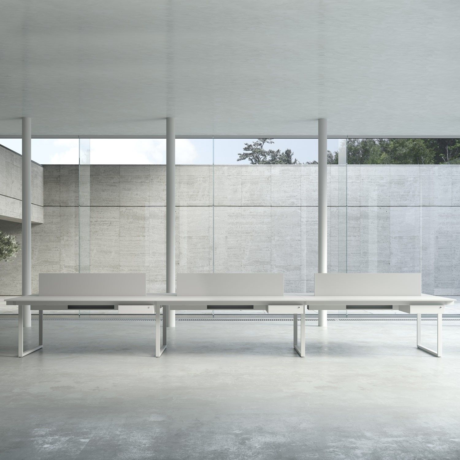 Bright Modern Office Space With White Workstations And Concrete Walls Featuring Natural Light