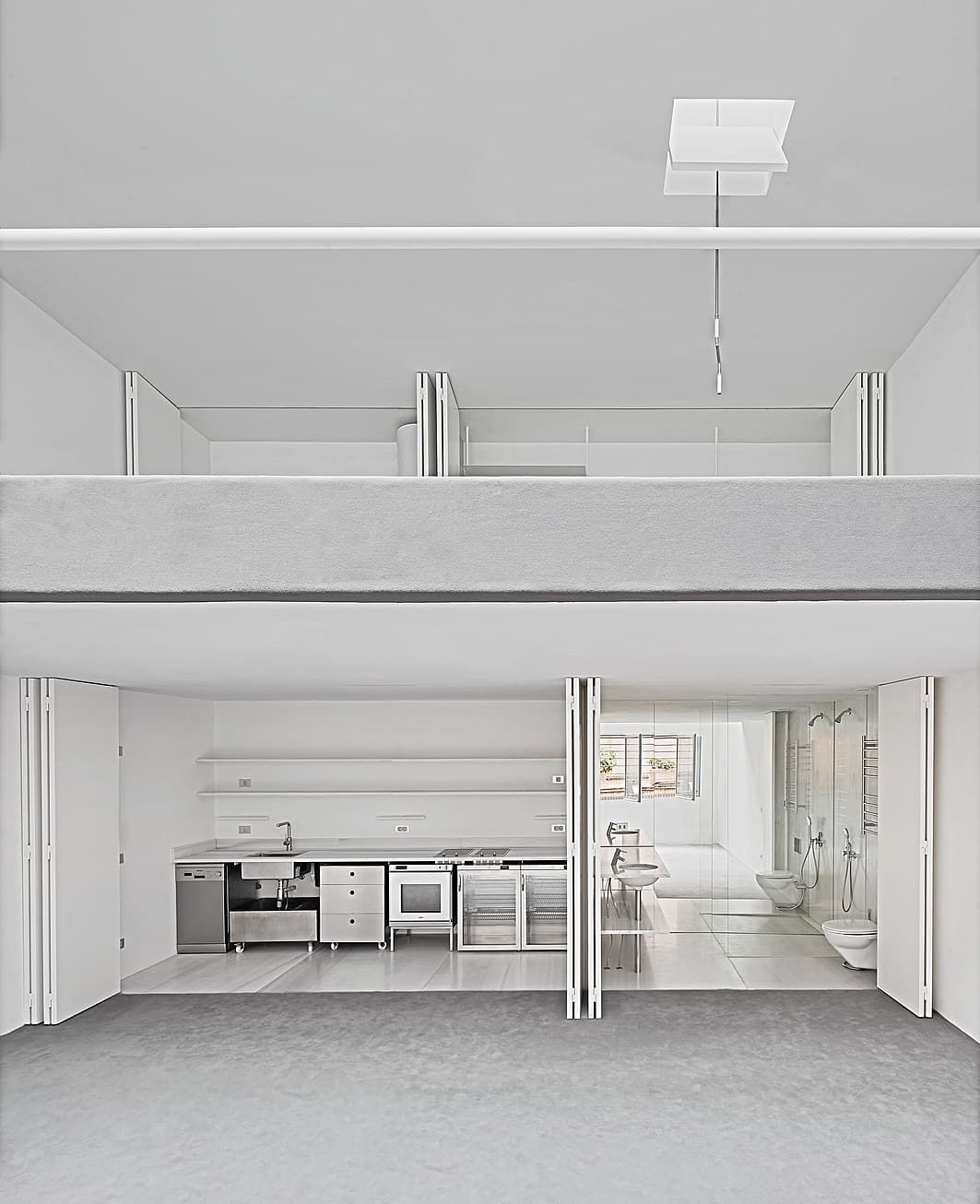Bright Modern Two-Level Loft Apartment Featuring A Minimalist White Kitchen And Glass Bathroom