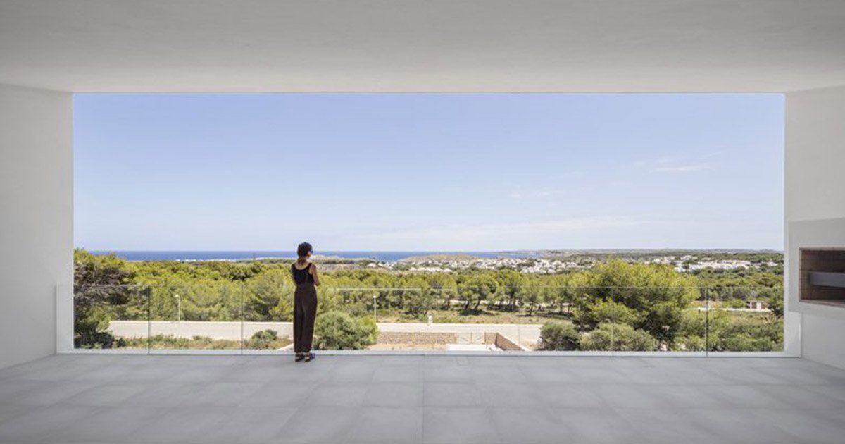 Brightly Lit Modern Terrace With A Woman Enjoying A Panoramic View Of Lush Coastal Scenery