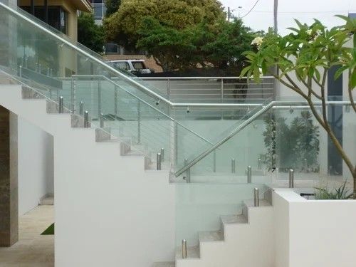 Clean Modern Outdoor Stairs With Transparent Glass Railings And Polished Metal Posts Bathed In Sunlight
