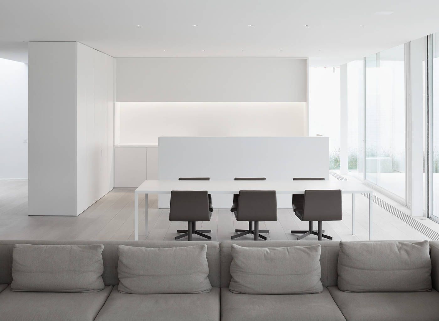 Clean White Workspace Featuring A Long Table Dark Chairs And A Cozy Grey Sofa