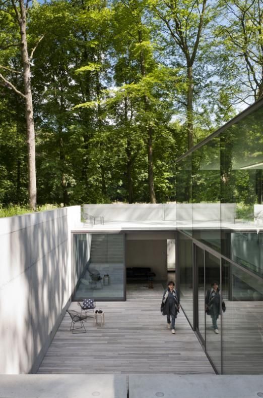 Contemporary Glass And Concrete Architecture Nestled In A Bright Forest With A Figure Walking Below