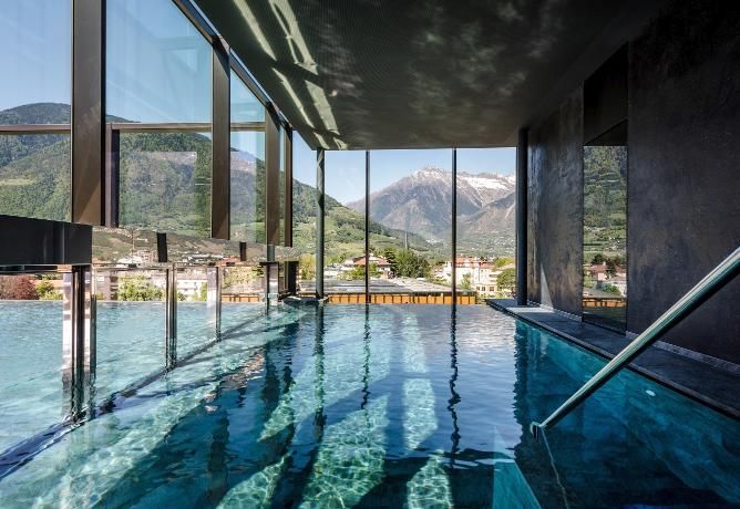 Indoor Pool With Stunning Mountain Views Featuring Clear Blue Water And Bright Natural Light