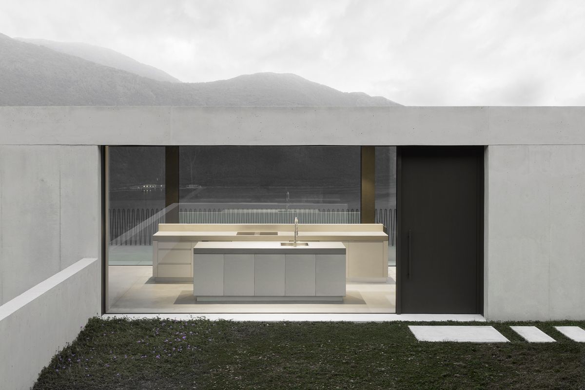 Minimalist Concrete Building With A Modern Kitchen Displaying Overcast Lake And Mountain Views