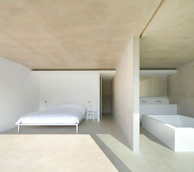 Minimalist Interior With A Bedroom And Bathroom Featuring Concrete Walls And Strong Sunlight