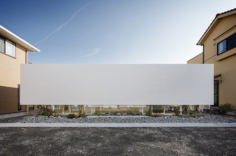 Minimalist White House Design Featuring A Wide Floating Wall Under A Sunny Blue Sky