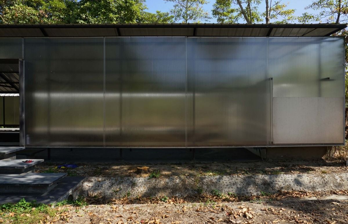 Modern Building Displaying Corrugated Translucent Panels Under A Bright Sunny Sky
