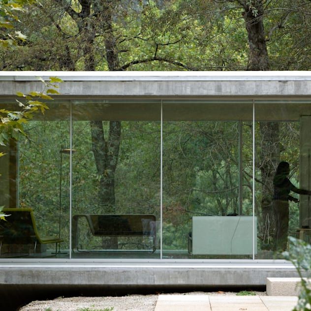 Modern Glass House Surrounded By Lush Forest And Illuminated By Natural Daylight