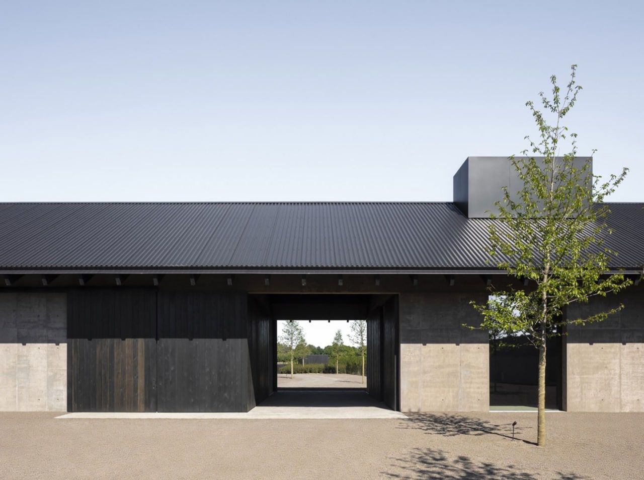 Modern Minimalist Architecture With Dark Corrugated Roof Concrete And A Bright Archway Passage