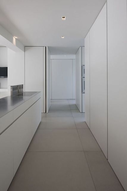 Modern Minimalist Kitchen Hallway With White Cabinets Grey Tiles And Bright Recessed Lighting