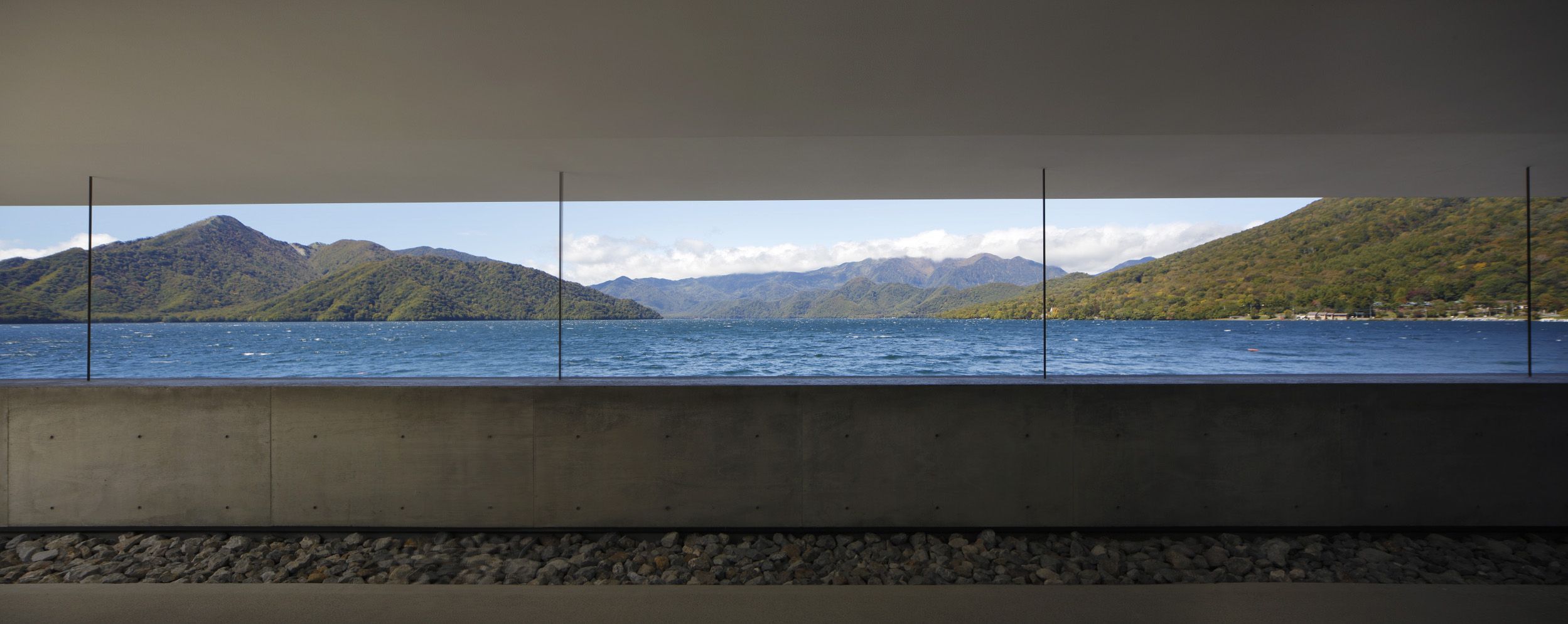 Panoramic Lake View Through Modern Concrete Frame With Distant Mountains And Bright Blue Water