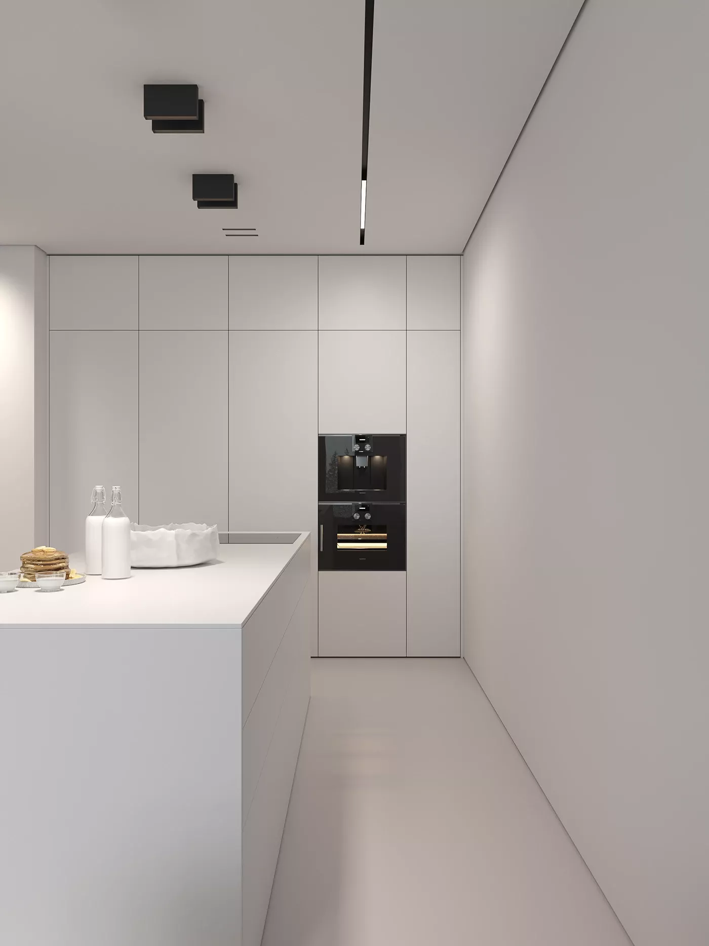 Serene Minimalist Kitchen Displaying Sleek White Cabinetry An Island And Modern Overhead Lighting