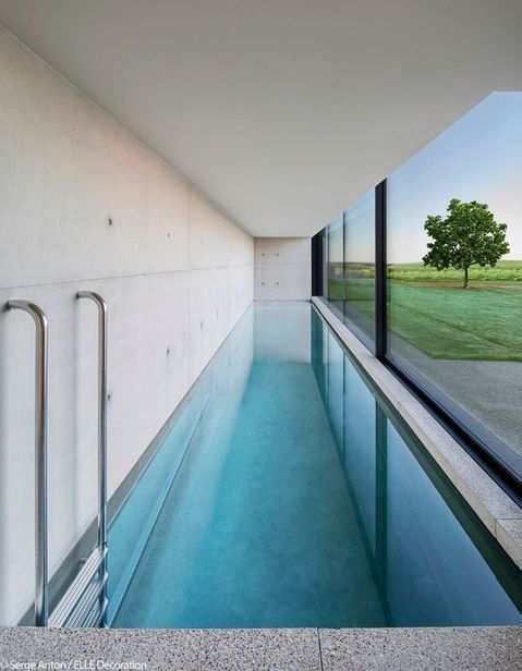 Sleek Indoor Swimming Pool With Concrete Walls Glass And Bright Natural Light