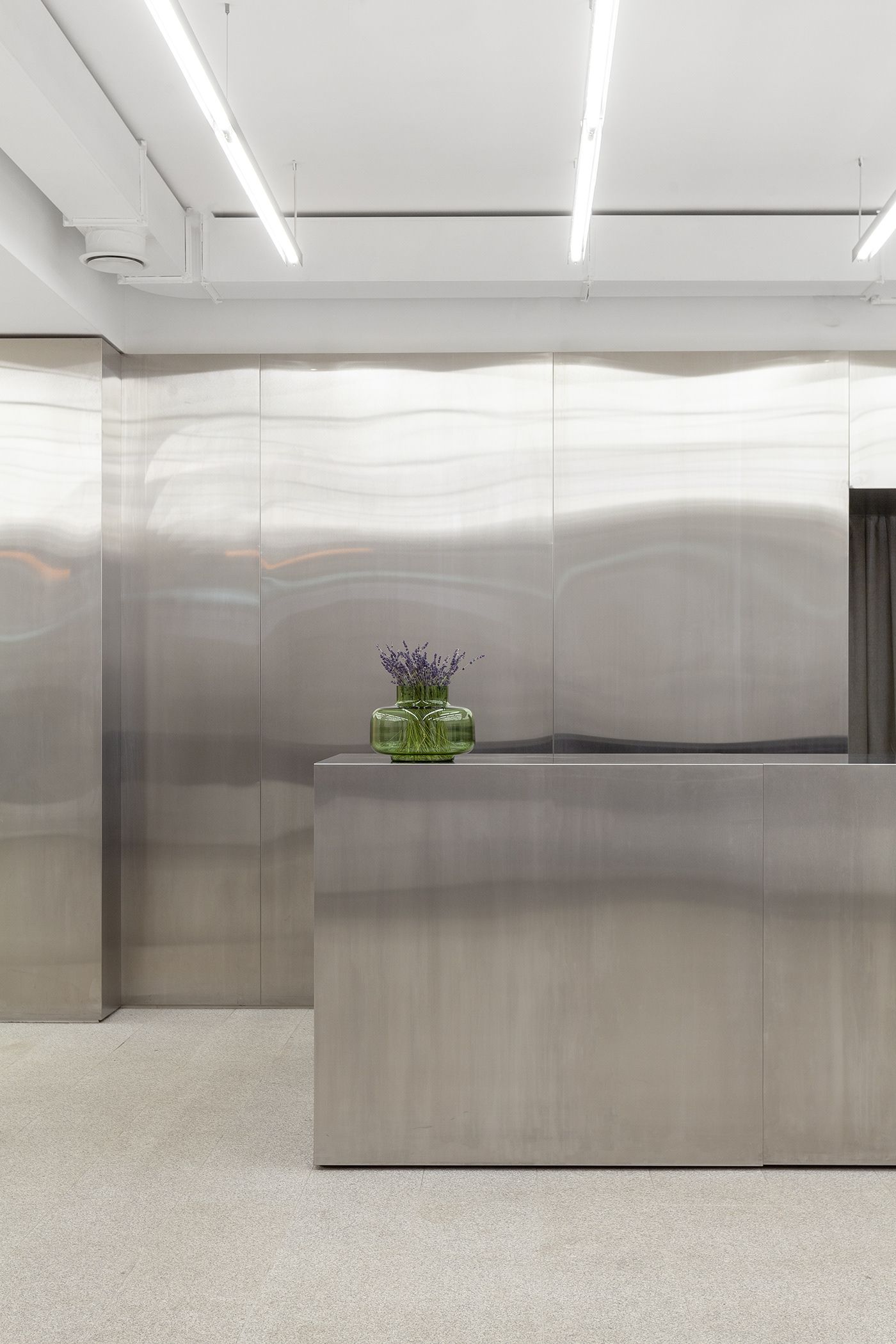 Sleek Metallic Interior Featuring A Reception Desk With Lavender Under Bright Fluorescent Lighting