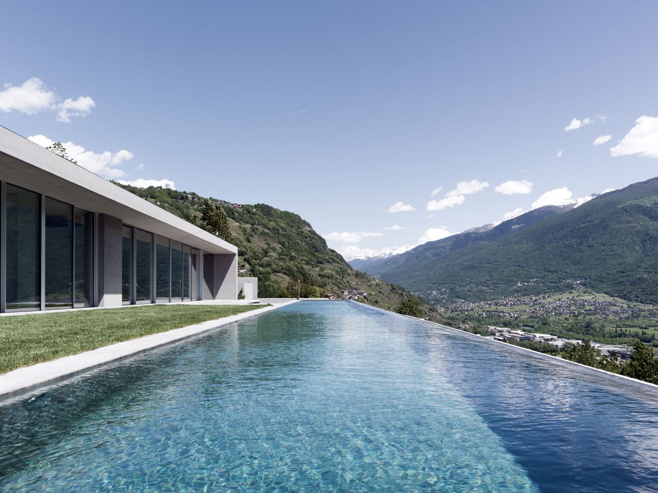 Sleek Minimalist Villa With An Expansive Infinity Pool Displaying A Breathtaking Sunlit Mountain Vista