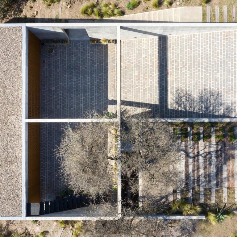 Sunny Aerial View Of A Modern Complex With Contrasting Paving Bare Trees And Geometric Shadows