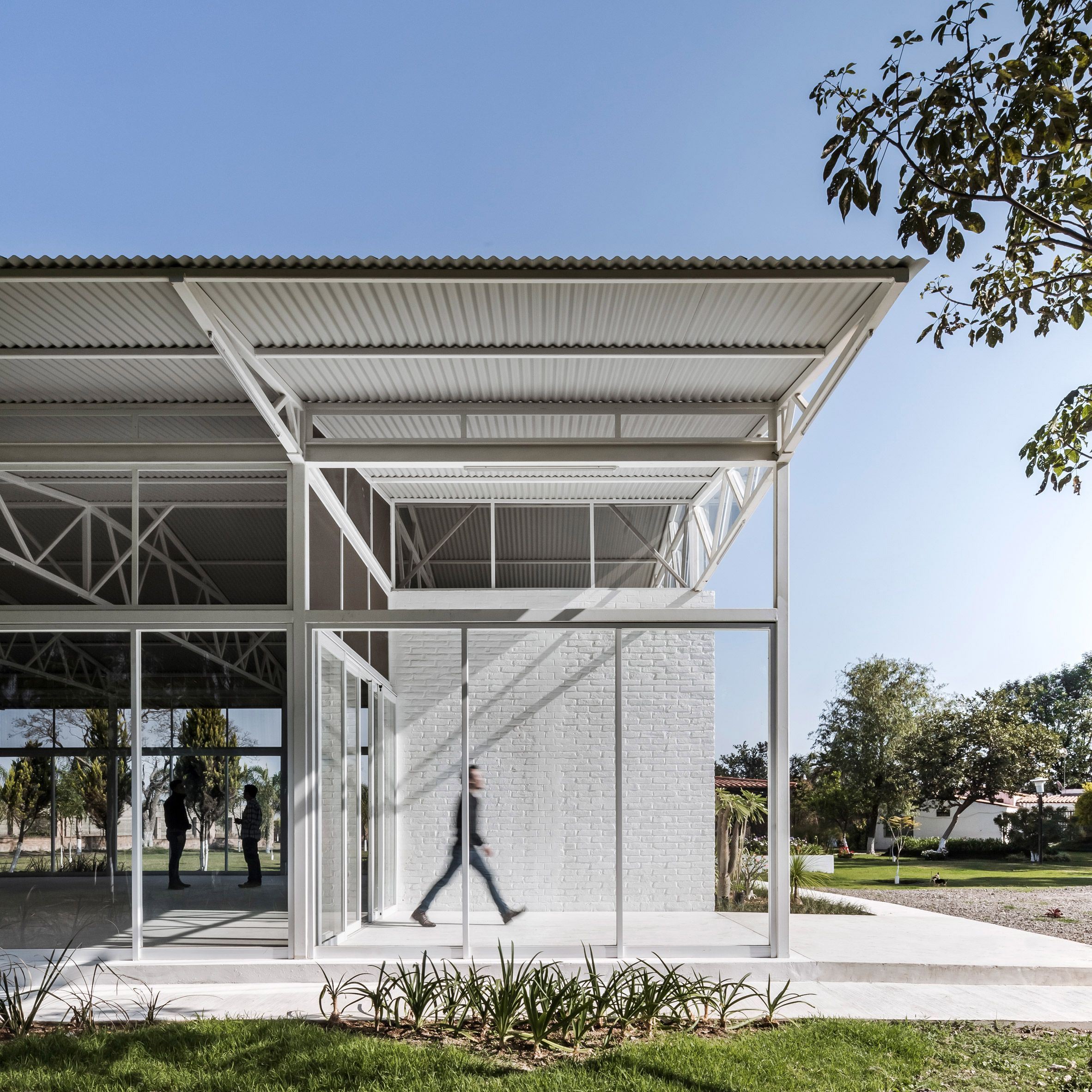 Sunny Modern Building Featuring White Metal Structure Glass Walls And A Person In Motion