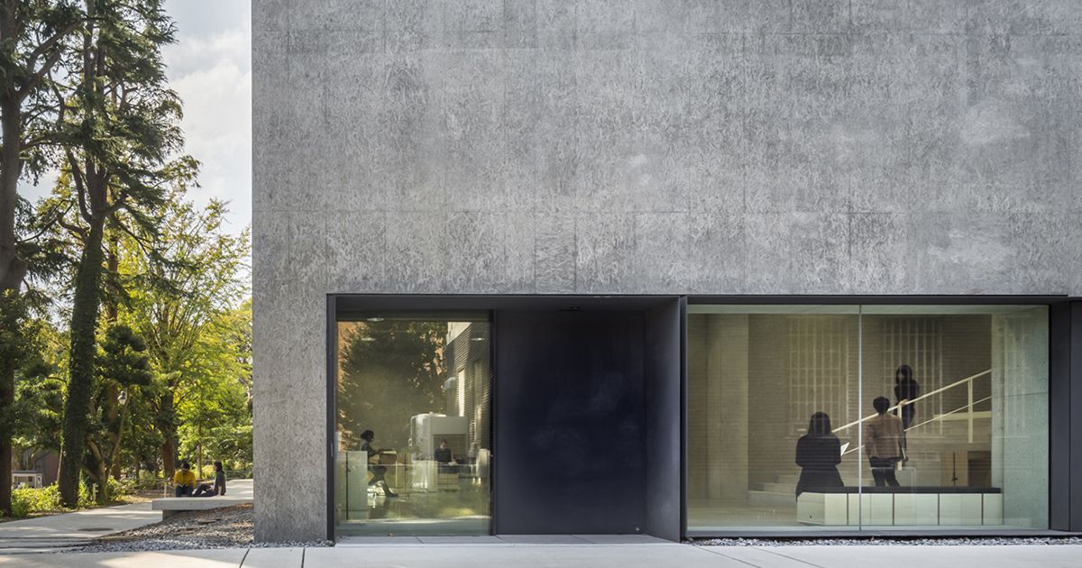 Textured Concrete Building With Expansive Glass Showcasing People Inside And A Sunny Park