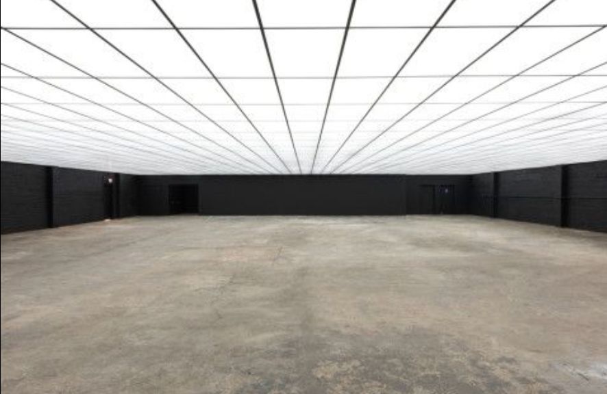 Vast Empty Hall With Black Paneled Walls Concrete Floor And A Luminous Grid Ceiling