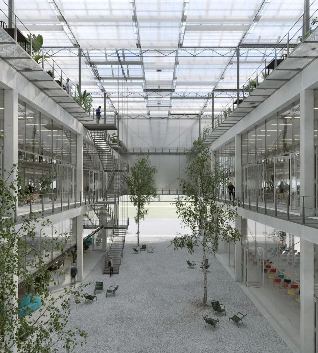 Vast Modern Atrium Featuring Concrete Glass And Interior Greenery With Bright Diffused Light
